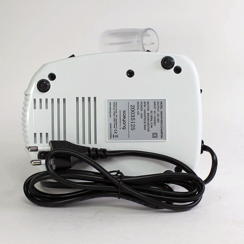 Оригинальный блок управления, произведен в Южной Корее на заводе Saeyang, официально поставляется в Россию, имеет гарантийный талон производителя и инструкцию на русском языке. Блок управления Marathon 3 Champion White мощностью 45 Вт, с реверсом. Цвет - Белый. Питание от сети 220В, вилка евростандарт. С защитой от перегрузки. Регулировка скорости - Плавная. Также в комплекте: держатель наконечника (стакан) на корпусе. Без педали.