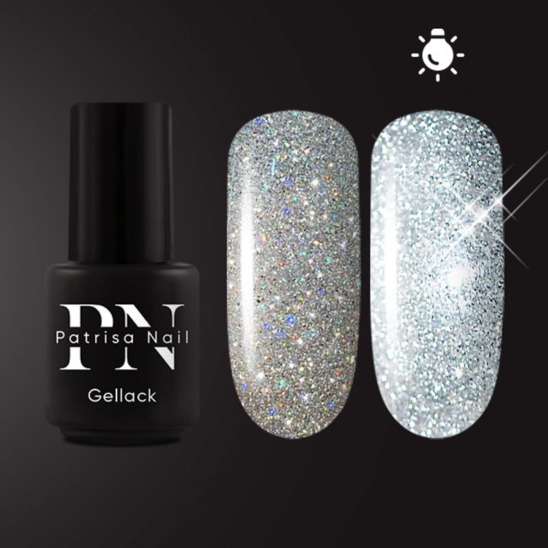 Гель-лак (3,5 мл) на прозрачной подложке со светоотражающими серебряными блестками.